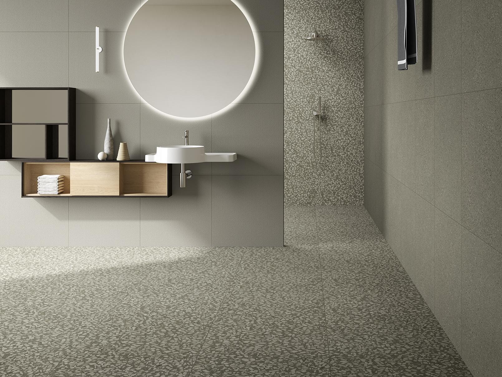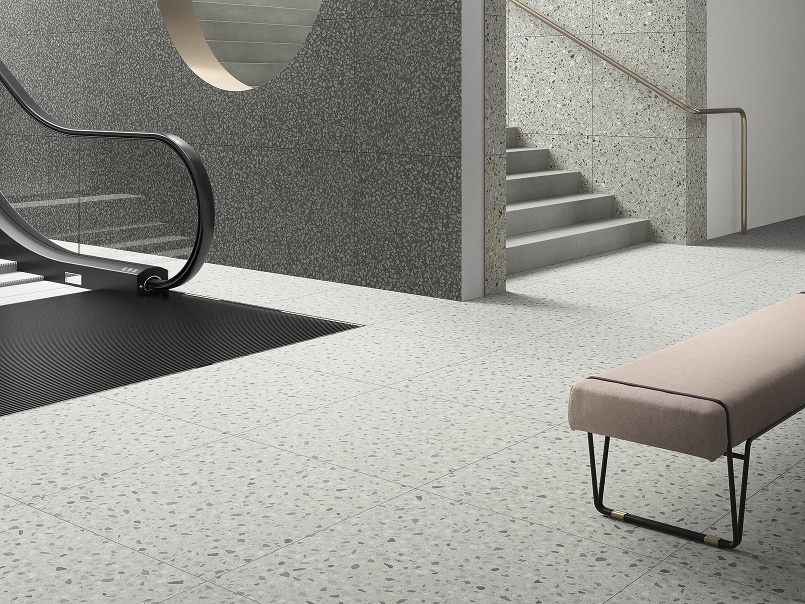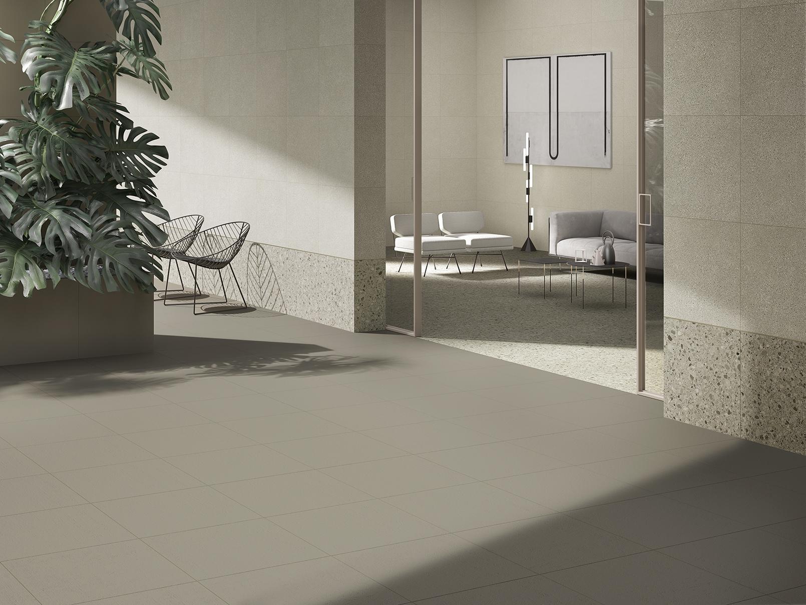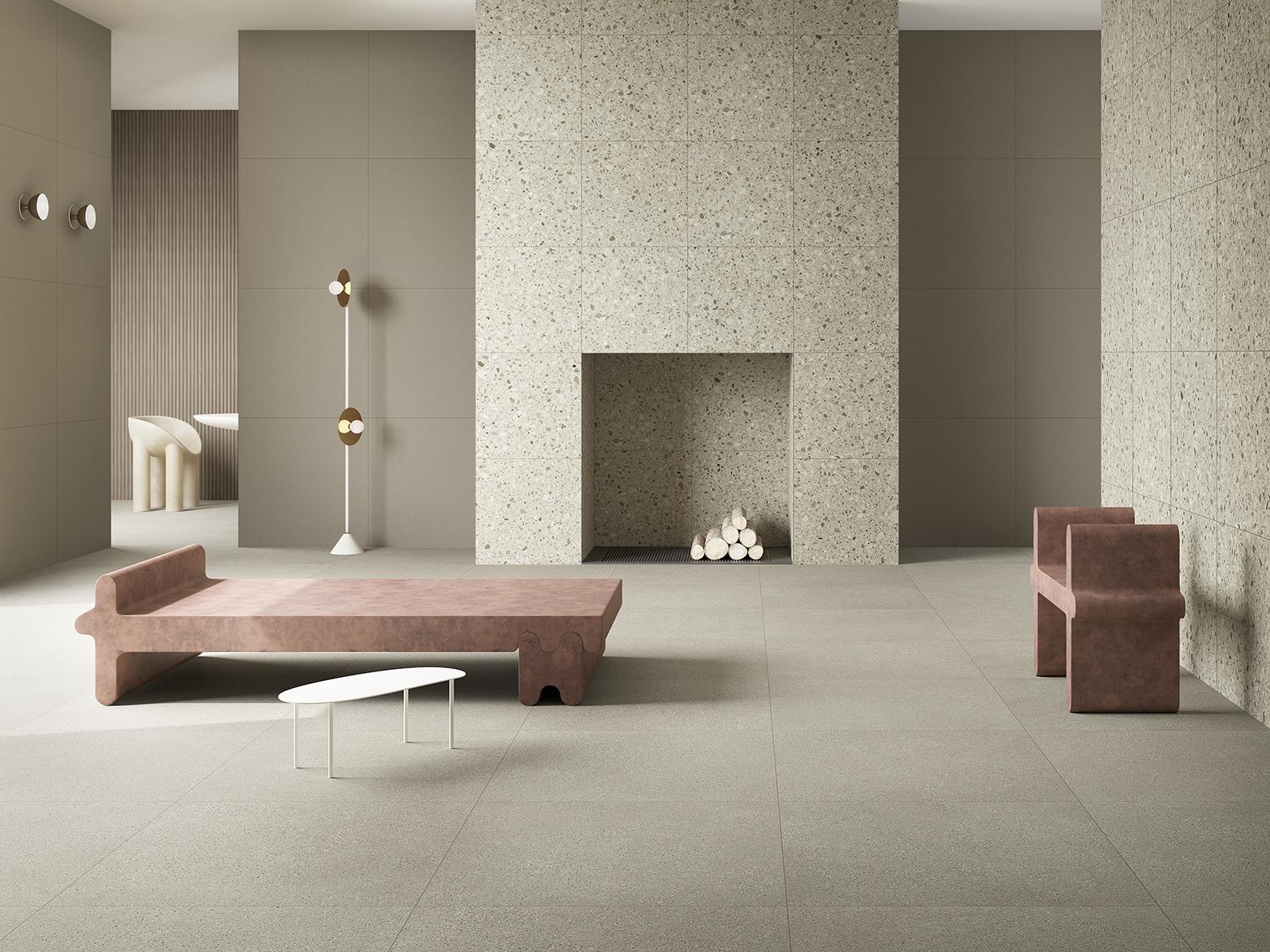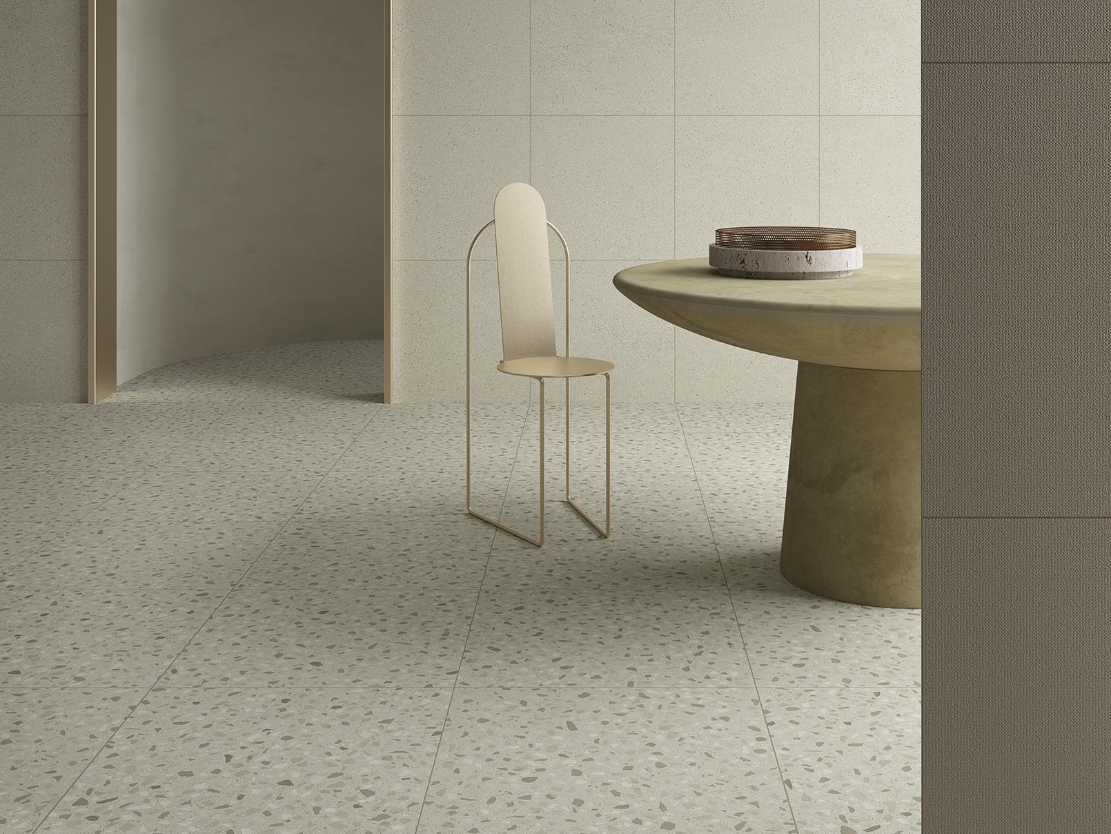Inspired by the trend of minimalism, Cement Mix softens the traditional brutalist look of cement with a variety of warm earth tones. Its calm relief appearance reinterprets the look of terazzo using modern geometric patterns of marble chips. Designed in different layers of cement appearance, Cement Mix brings a whole new dimension to industrial design on floors and walls, in these three variants named Fine, Micro and Flake.