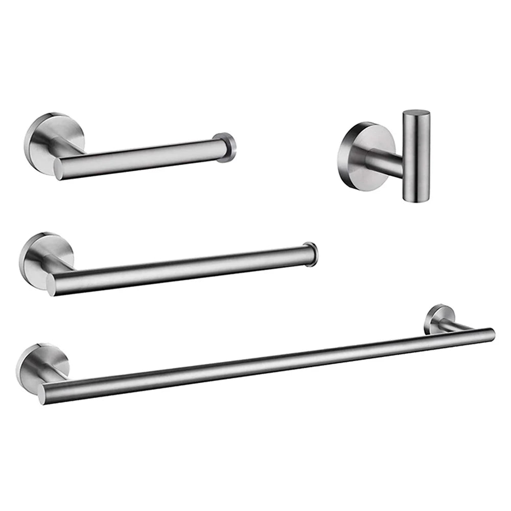 Complete your bathroom with this assorted accessory set! This kit includes 4 essential items for your bathroom: towel rack (25''), hand towel rack, toilet paper holder and bathrobe hook.