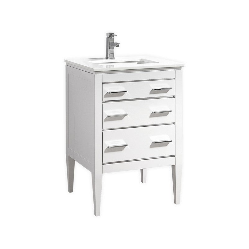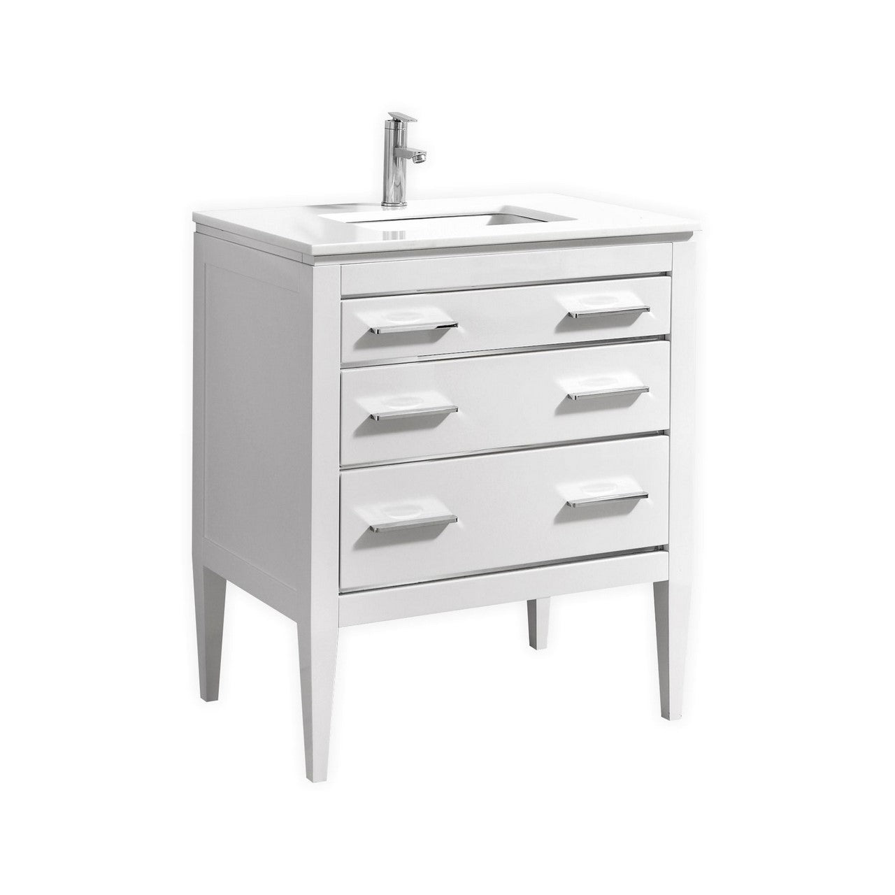 Inspired by both the art deco movement of the ’20s, ’30s, and ’40s and the elegant simplicity of European design, the Eiffel Bathroom Vanity was created from responsibly sourced Solid Wood. Each piece is assembled using intricate shapes that slot together forming a sturdy yet graceful structure. The Eiffel Vanity features a pure white countertop with a white Ceramic under mount Sink. The cabinet is finished in a white lacquer paint finish, while the inside of the drawers is varnished, with the natural wood color exposed.