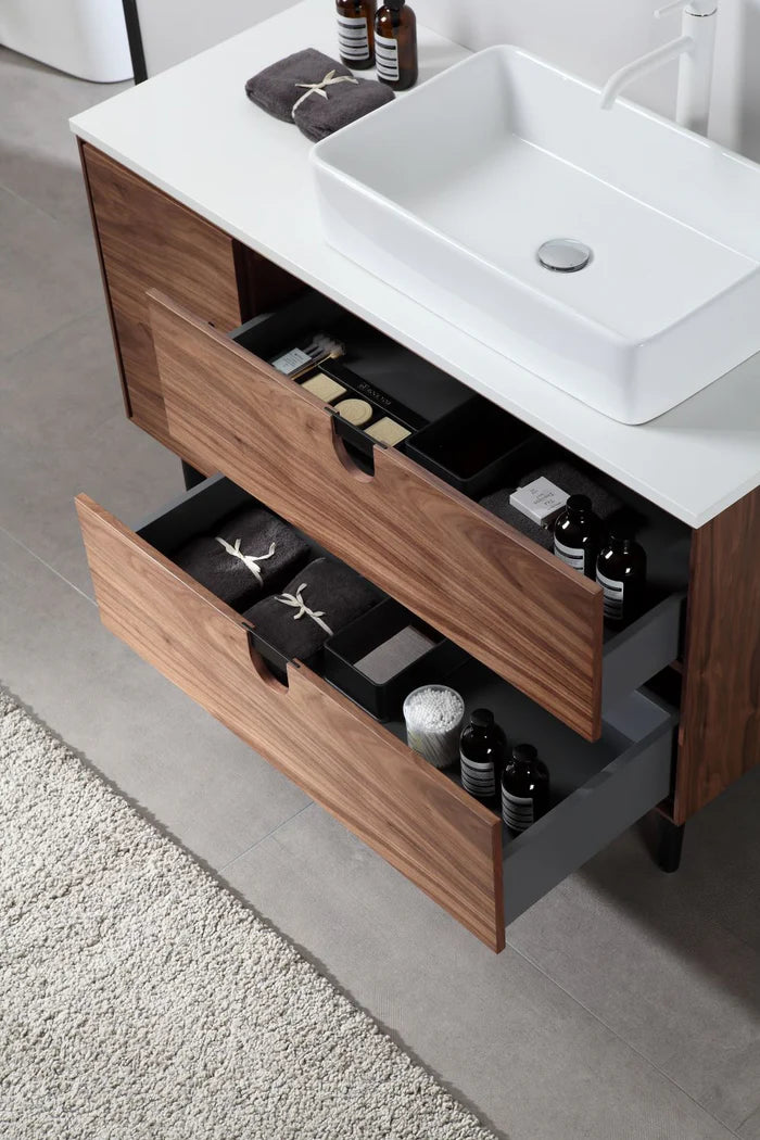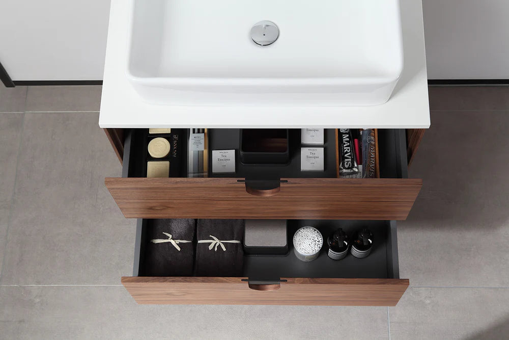 This small storage unit with solid oak wood fronts is ideal for adding a touch of natural chic to your bathroom. Equipped with two drawers and a white quartz countertop, this unit will provide you with a new designer storage space.