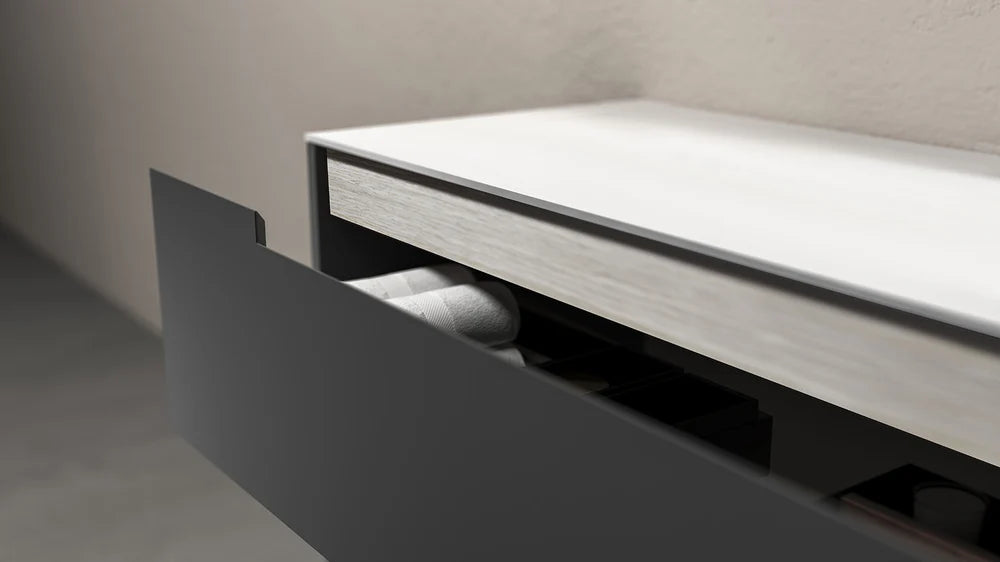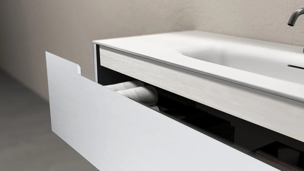 The INES vanity is defined by clean lines and elegant lacquered panels for a modern-style appearance in your bathroom. It's the perfect center piece for any bathroom.
