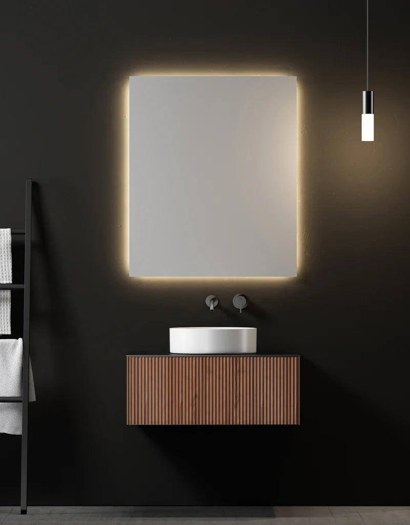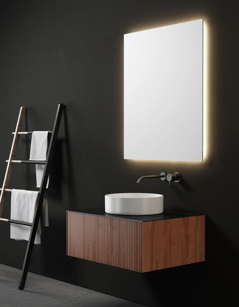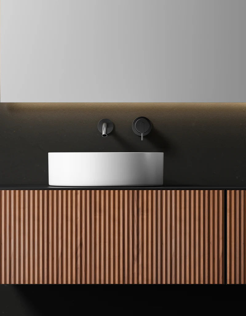 The INGRID hanging vanity brings modern style to a bathroom or powder room with its organic aesthetic and the clean lines of natural corrugated wood.