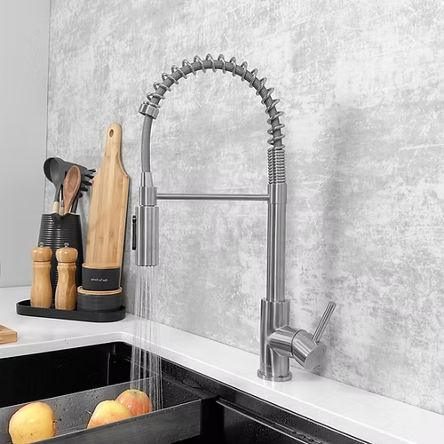 Upgrade your kitchen with this sleek, spring pull-down faucet. Experience the best of both worlds: effortlessly switch between a gentle aerated stream for delicate tasks and a powerful spray for tackling tough messes. Designed for reverse osmosis systems, this faucet ensures you always have access to the purest, most refreshing water – perfect for health-conscious families. Plus, enjoy complete freedom with full regular faucet functionality, even when the filtration system is not in use. Featuring a 360° swivel spout that extends up to 18 inches, this faucet offers incredible reach and flexibility. Crafted from solid brass with stunning spiral details, it's as beautiful as it is functional. Built to last, this faucet boasts a durable ceramic cartridge tested for over 500,000 cycles and an industry-leading slim aerator that conserves water without compromising pressure. Easy to install and compatible with most standard sinks, it comes with braided stainless-steel hoses. Choose from a range of finishes – brushed gold, stainless steel, or matte black – to perfectly complement your kitchen's unique style. Experience the difference with this premium faucet that delivers both superior water quality and exceptional performance.