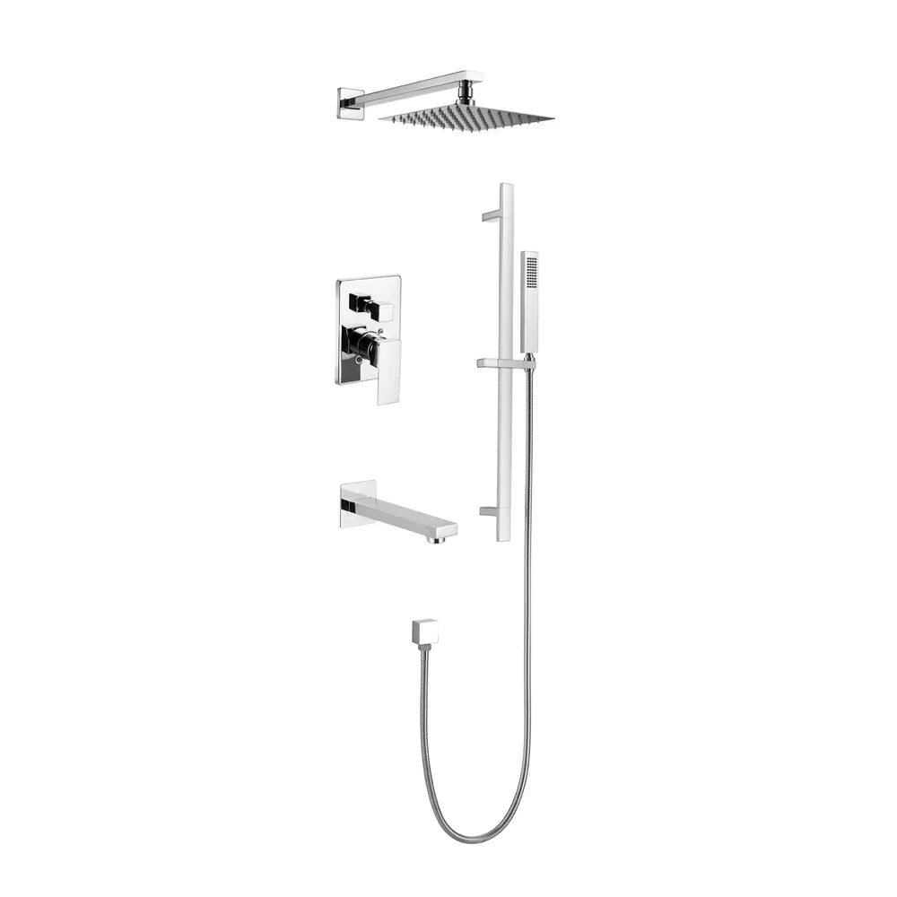 Complete your bathroom by adding this 3-function bath shower faucet. This set includes the rain head shower, the hand shower and rail, the bath spout, the valve and the diverter. The ceramic cartridge and the solid brass body ensure the longevity. With its recatngular features, VASSO is the perfect design for a modern-style bathroom!