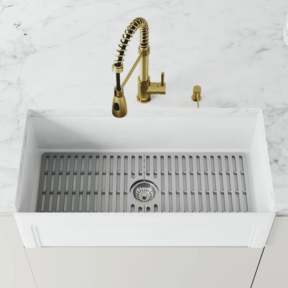 Combining the best of function and design is the Matte Stone™ Farmhouse Casement Apron Front Kitchen Sink with a Gray Silicone Grid. The non-porous, handmade Matte Stone™ composite offers unmatched chip, scratch, and impact resistance. Impervious to stains, the Matte Stone™ is also reversible. Install with either the detailed or flat apron front facing outward depending on your preference. For protection against clanging pots and pans, a heat-resistant, flexible gray silicone grid sits quietly inside the sink. Dishwasher-safe, BPA-free, and meeting FDA Food Contact Regulations, this grid provides added safety and security for your Matte Stone™ sink. Pair this sink with any single-hole kitchen faucet and enjoy your kitchen as it was meant to be.